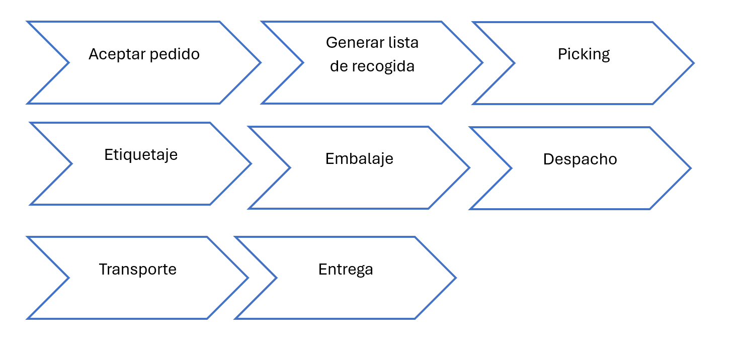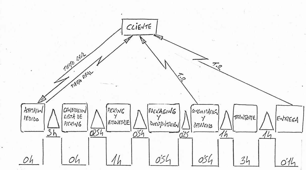 Una forma habitual de representar un proceso es mediante la utilización de la metodología VSM (Value Stream Mapping). Las actividades se representan con recuadros y las esperas o colas con triángulos. Los tiempos se representan en la parte inferior del esquema. En la Figura 3.1. vemos el caso de un proceso logístico de distribución de pedidos de comercio electrónico. En este caso el Lead-time total es de 11,1 horas desde la recepción del pedido hasta su entrega. El significado físico es que de media, desde que un cliente hace el pedido y se le entrega se tarda de media 11,1 horas.