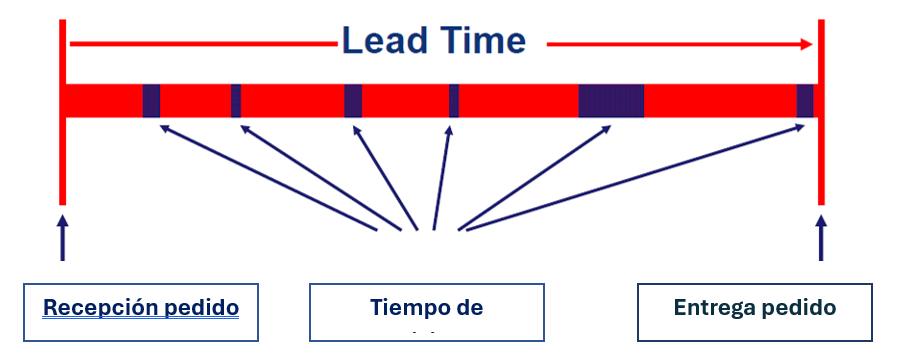 El lead-time total se compondrá de la suma de pequeñas porciones de tiempos de actividad (en azul) intercaladas con tiempos de espera (en rojo).