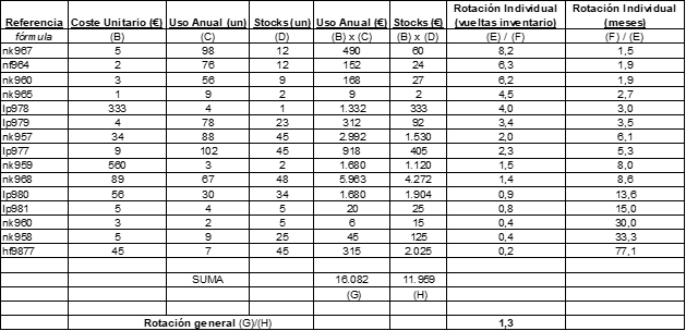 Rotación de la Referencia i = (Cantidad consumida en el año de la referencia i)/(Cantidad media en stock de la referencia i)