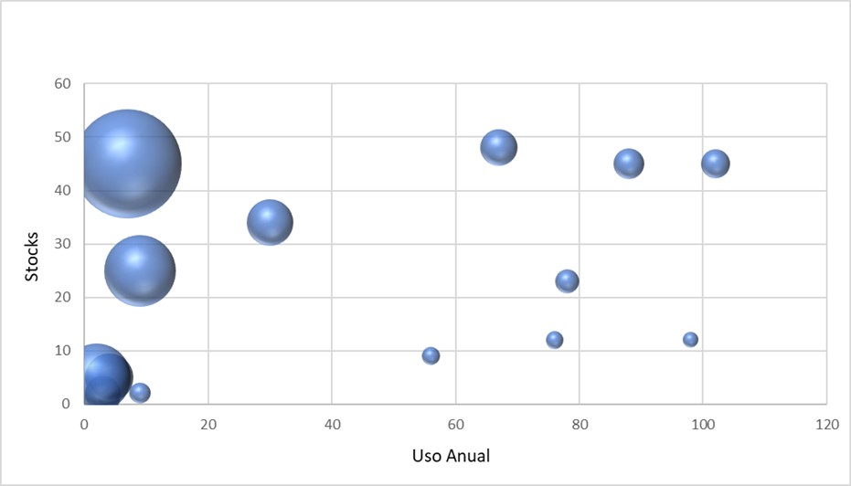 Si se representa en una gráfica las referencias en relación al consumo y los stocks y para cada referencia se representa con un círculo el valor de la rotación en tiempo obtenemos la siguiente figura.