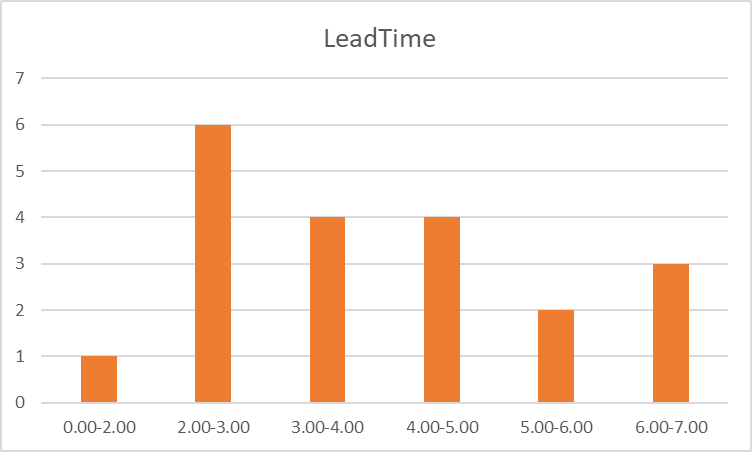 Si representamos en un histograma de frecuencias del Lead-time (012) y obtenemos la Figura 3.3. representa claramente una la falta de control del proceso, no hay repetibilidad en el valor del lead-time. Hay necesidad de mejora en este aspecto para poder facilitar un servicio adecuado a los clientes.