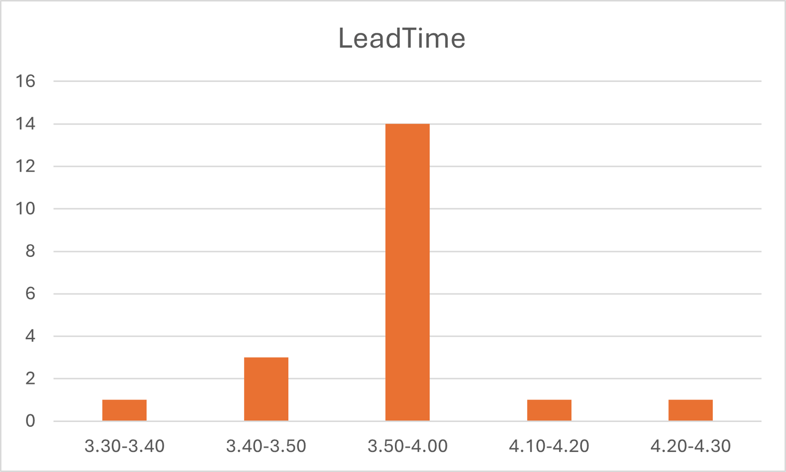 El objetivo, dando por supuesto que 3 horas y 52 minutos (Lead-Time) sea un plazo de entrega competitivo para el mercado o los clientes a los que sirve el centro de distribución, seria obtener un histograma de un perfil semejante al siguiente. Donde las desviaciones sobre el Lead-Time medio son mínimas.