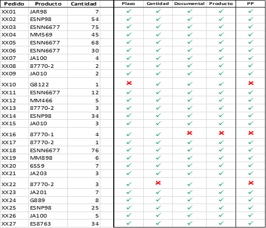 Supongamos hemos entregado a los siguientes pedidos con el resultado indicado en la Figura 5.1. Clasificamos las posibles no conformidades en 4 categorías: