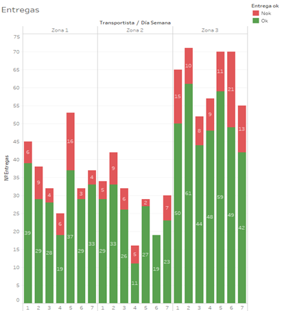 Es conveniente profundizar en el análisis de este indicador para comprender qué circunstancias o variables están influyendo en los problemas de entrega por parte de cada transportista. En el gráfico siguiente se presenta el desempeño de un transportista en función de la zona de reparto y del día de la semana.